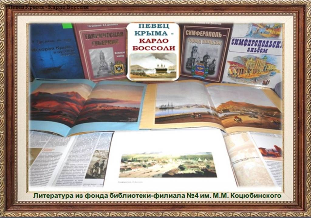 «Симферополь – город пользы», «Таврическая губерния: история в очерках» и «Таврическая губерния: великие имена» Г. Бабенко и В. Дюличева, «Симферопольский альбом», краеведческие журналы «Полуостров сокровищ», «Крым», «Крымские каникулы» и другие краеведческие издания из фонда библиотеки представляют вниманию читателей красочные репродукции картин Боссоли, посвященных Крыму, рассказывают о его жизни и творчестве.