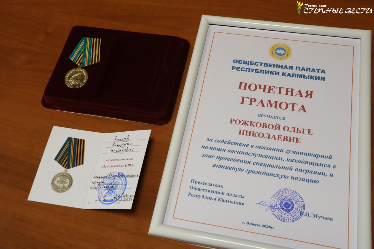 «Ваша поддержка очень важна для военнослужащих. По поручению командира добровольческого штурмового корпуса министерства обороны России генерал-майора Дениса Александровича Барило с огромной благодарностью вручаю вам медаль «За содействие специальной военной операции», – сказал ветеран СВО, советник председателя Общественной палаты Калмыкии Арсланг Одгаев.