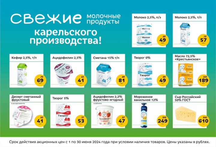 С 1 по 30 июня 2024 года во всех магазинах фирменной сети «Олония» можно купить свежие, вкусные, качественные продукты Олонецкого молочного комбината по выгодной цене. Например, молоко в мягкой упаковке – всего за 49 рублей, творог 5% — за 53 рубля, а сметанный десерт – за 41 рубль.