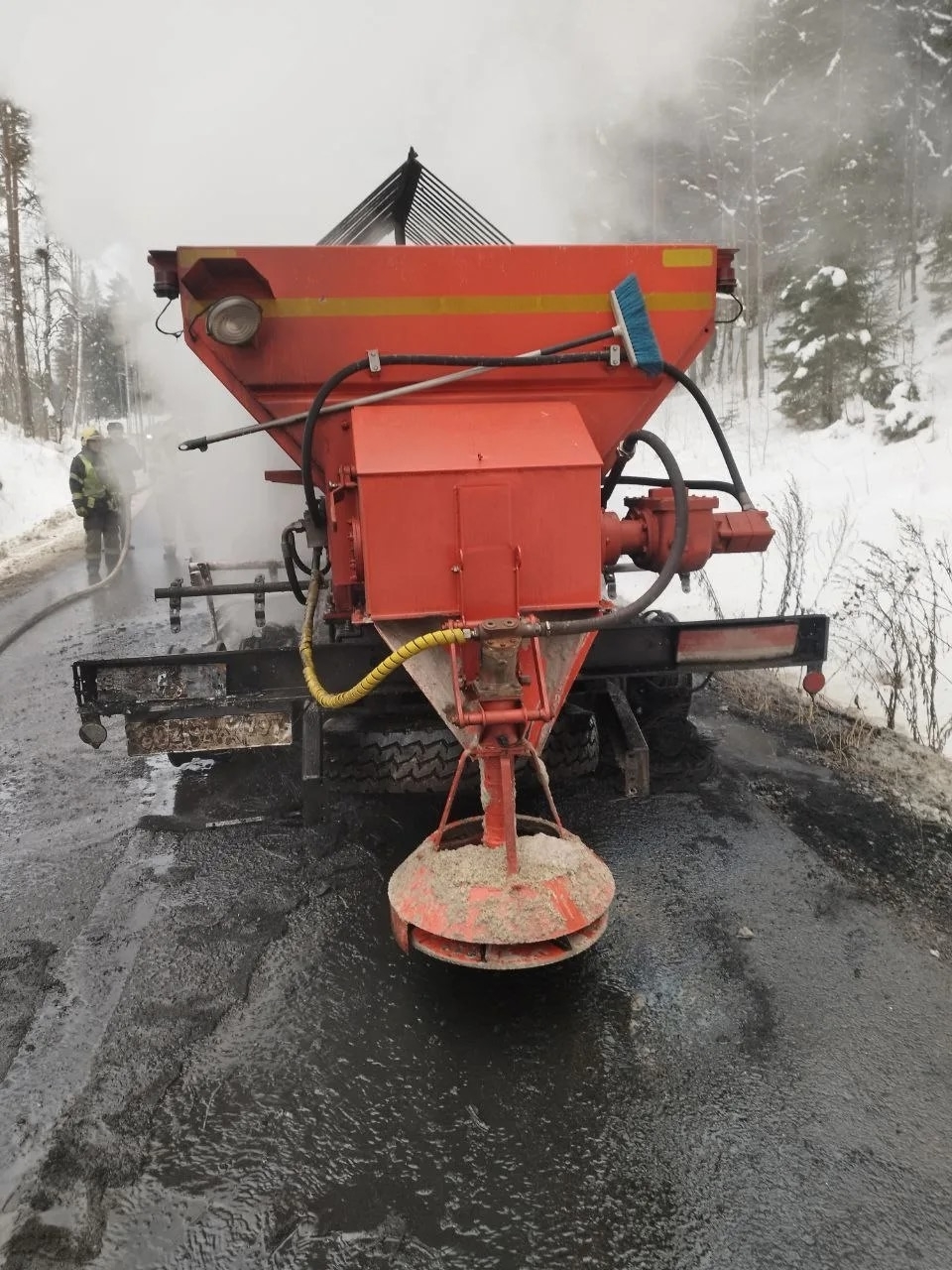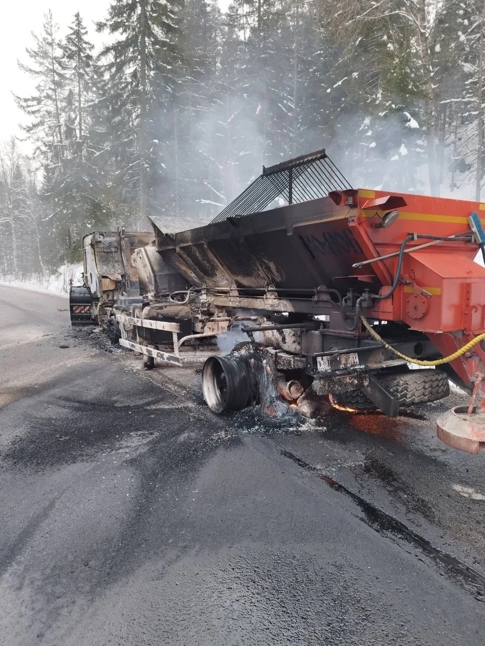 В Карелии сгорел КамАЗ, который посыпал песком трассу.