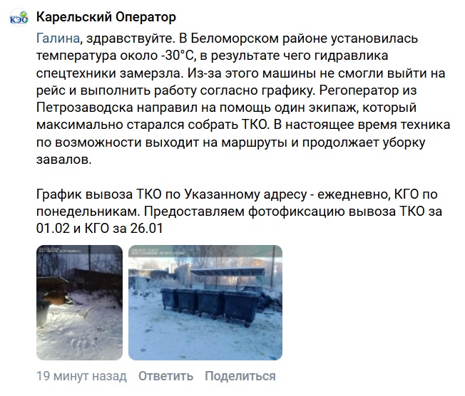 В комментариях представитель Карельского экологического оператора сообщил, что спецтехника не смогла выехать на уборку мусора из-за сильных морозов. По возможности мусорные завалы понемногу будут убирать.
