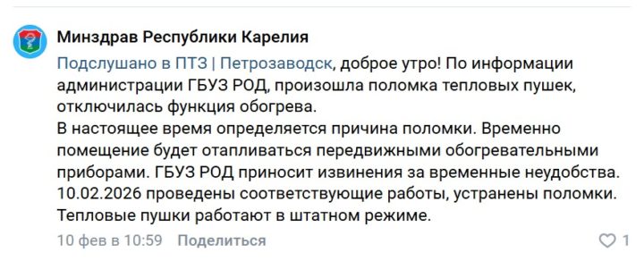 Вчера, 10 февраля, по данным Минздрава,  тепловые пушки починили.