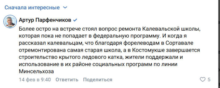 — Более остро на встрече стоял вопрос ремонта Калевальской школы, которая пока не попадает в федеральную программу. И когда я рассказал калевальцам, что благодаря форелеводам в Сортавале отремонтирована самая старая школа, а в Костомукше завершается строительство крытого ледового катка, жители поддержали и использование в их районе социальных программ по линии Минсельхоза, — написал в комментариях Артур Парфенчиков.