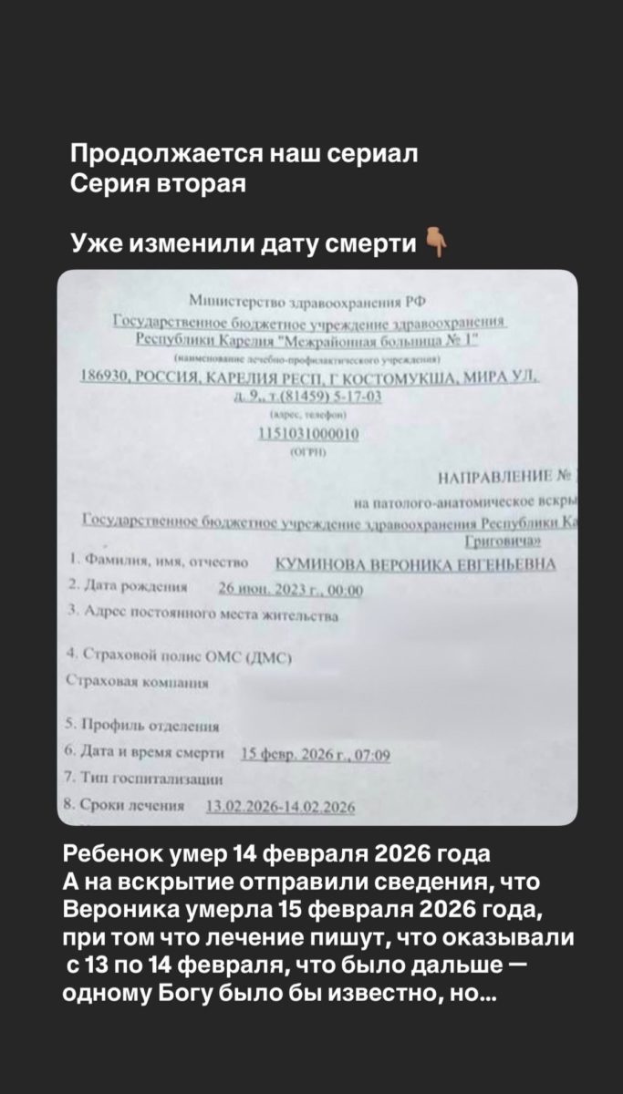 Медицинский юрист, занимающаяся делом смерти двухлетней Вероники Куминовой в больнице Костомукши, сообщила, что в медицинских документах изменена дата смерти девочки.