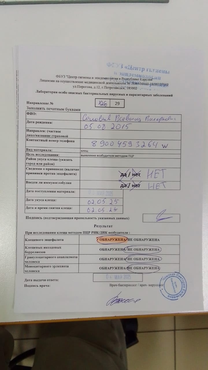 Валерий вспоминает, что Севу клещ укусил 2 мая на дачном участке. Он был обнаружен, целиком вытащен, сдан на исследование. А 4 мая получен плохой ответ, в этот же день мальчику ввели иммуноглобулин. То есть от укуса до укола прошло меньше двух суток.