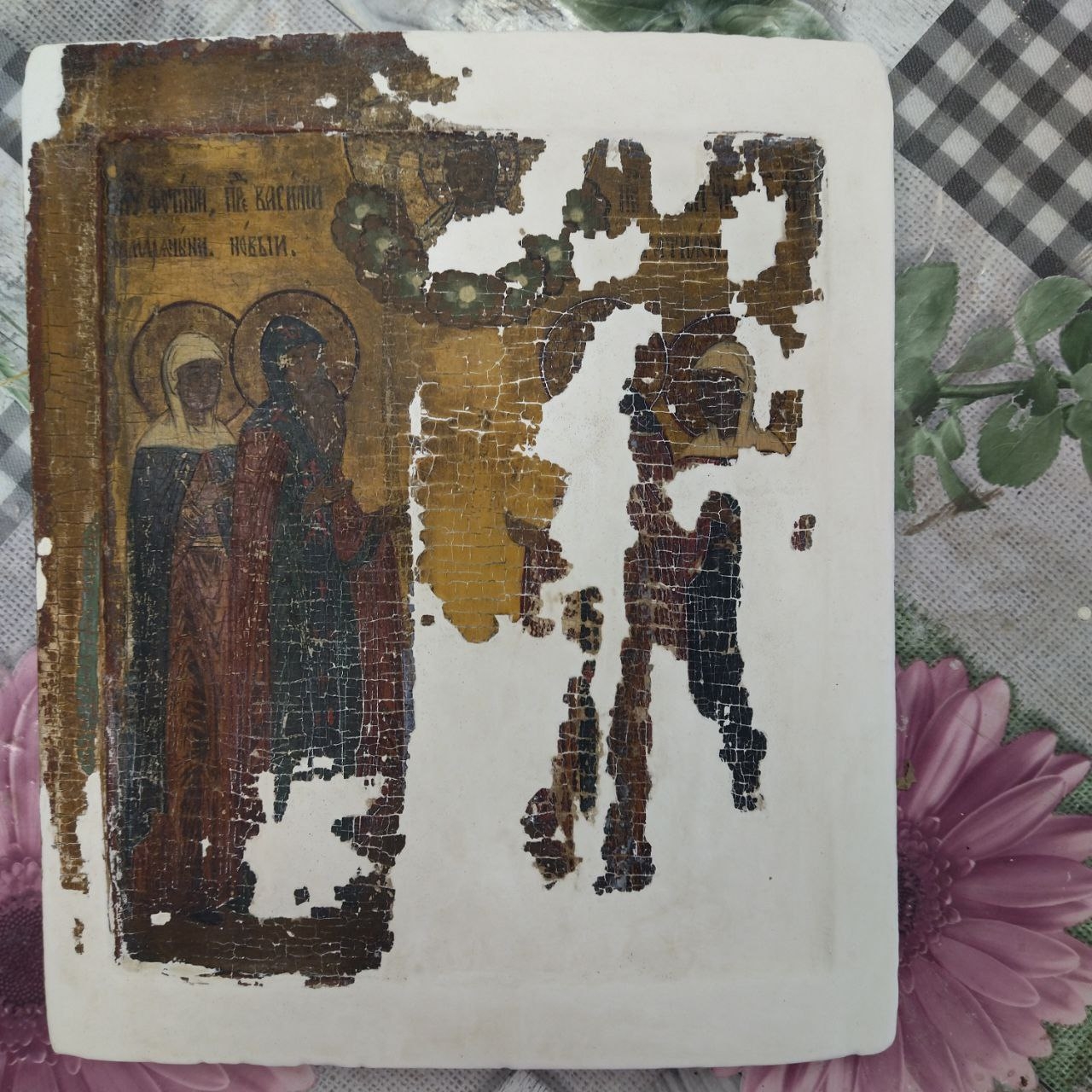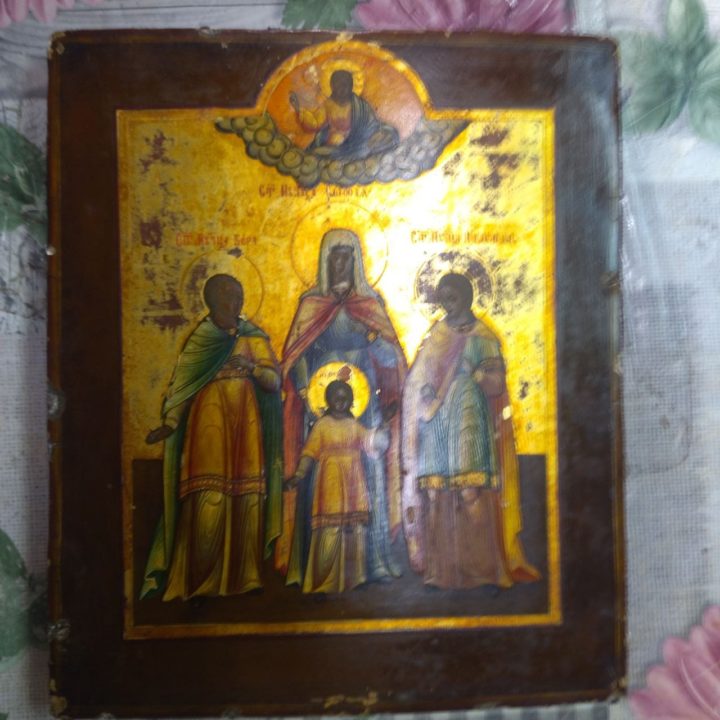 Икона «Четыре святых» — образец качественной имитации начала XX века, выполненный на старинной доске. Мастер срочно взялся за её спасение из-за угрозы полного осыпания красочного слоя. Также в работе находится образ «Воскресение с праздниками» на псевдозолоте, где требуется особо бережная расчистка, не затрагивающая историческое покрытие.