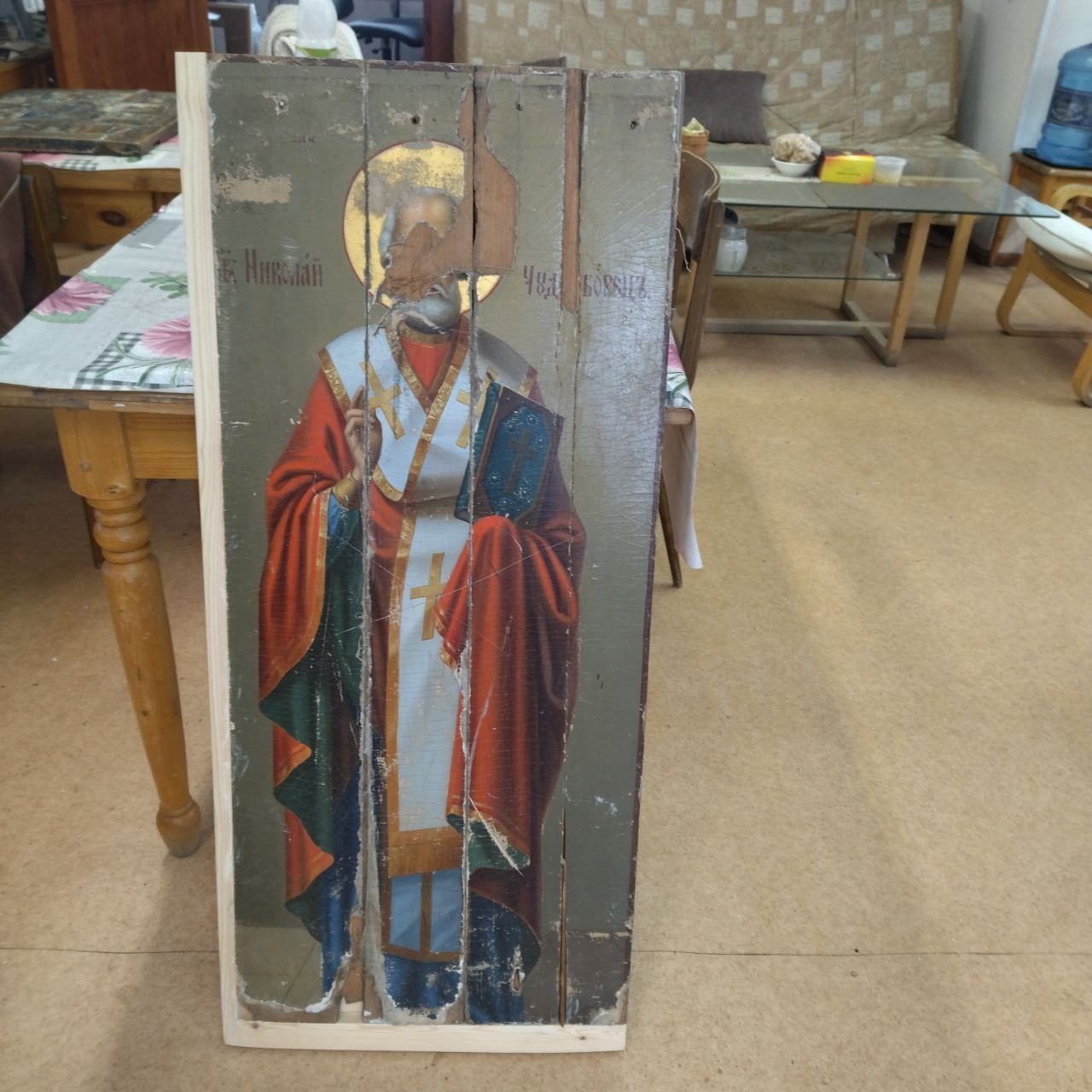 Особую сложность представляет восстановление иконы святителя Николая Чудотворца. По словам реставратора Александра, этот образ сильно пострадал в советское время: икона была расколота на части, а лик святого стесали топором. На данный момент деревянная основа уже склеена, восполнены некоторые утраченные фрагменты. Впереди специалистов ждет укрепление, восстановление грунта и самая сложная часть — реконструкция лика.