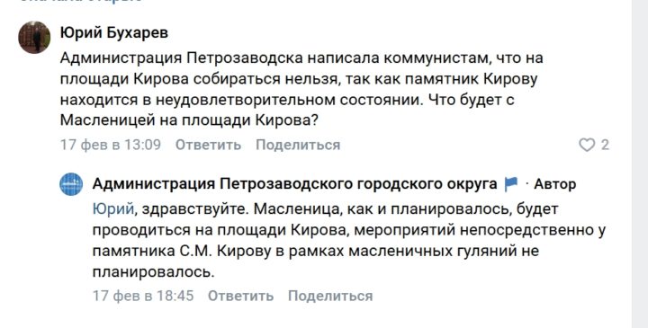 В соцсетях же представители мэрии сначала заявляли, что масленичные гуляния будут проводится не у памятника Кирова, а потом, что у памятника будут выставлены ограждения.