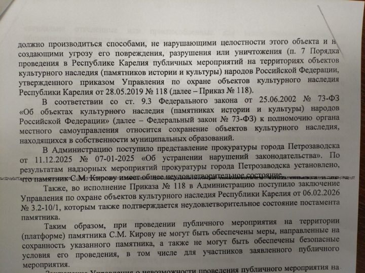 Но мы выяснили, памятник безопасен, находится у него можно, поэтому смысла нет ни в ограждениях, ни в запрете мероприятий у него. В пресс-службе мэрии Петрозаводска нам не смогли объяснить все эти противоречия, отметив, что не могут ответить на наши вопросы.