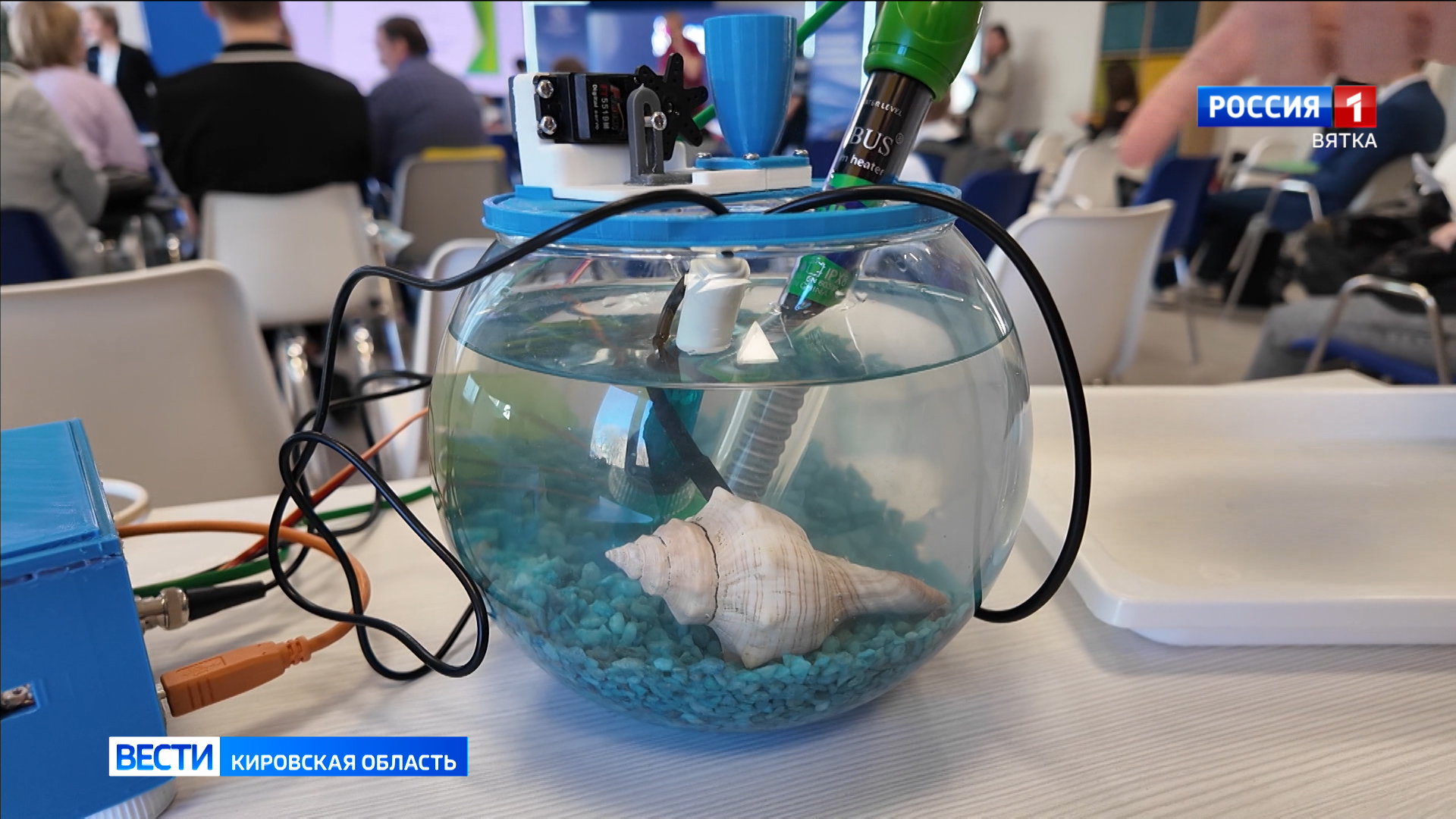 Роботы, модели приборов радиоэлектроники и автоматики - все это сделали школьники. Дмитрий Кузнецов представил членам жюри автоматизированную систему для аквариумов. С помощью прибора можно измерять температуру и качество воды.