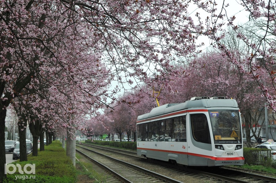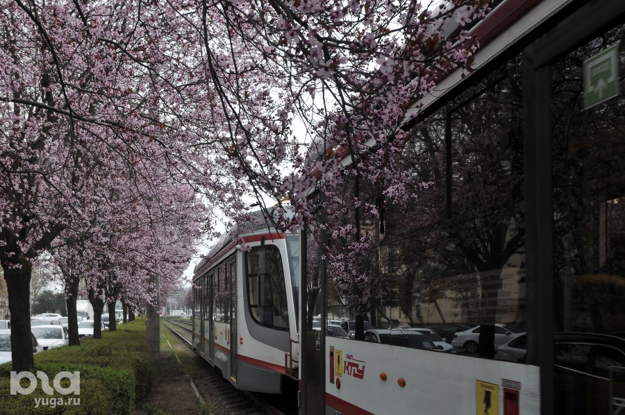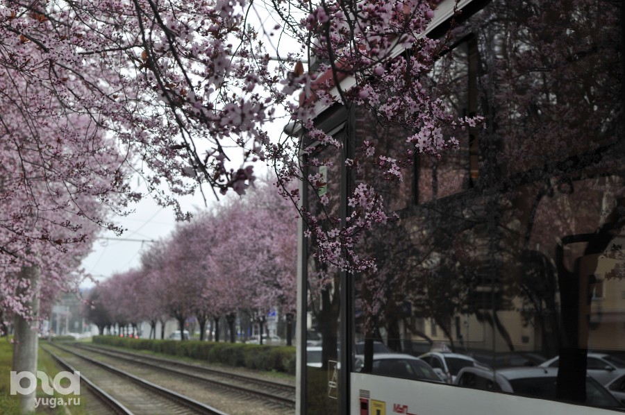 Сакура у трамвайных рельсов: на улице Ставропольской в Краснодаре расцвели сливы «писсарди»
