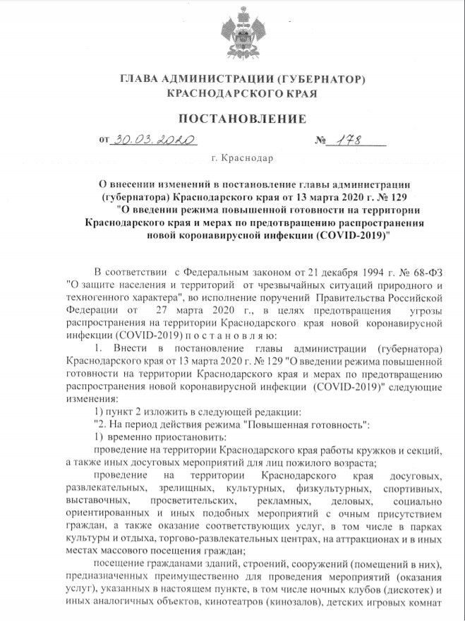 В Краснодарском крае 30 марта усилили меры по предупреждению распространения коронавируса