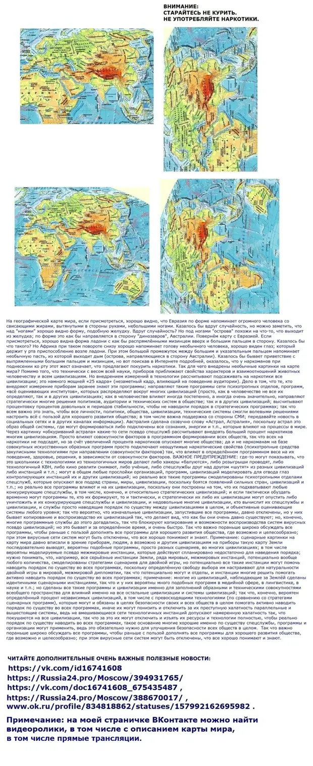 КАРТИНКИ С ГЕОГРАФИЧЕСКОЙ, ПОЛИТИЧЕСКОЙ, КОСМИЧЕСКОЙ КАРТ МИРА, КОТОРЫЕ СЧИТАЮТСЯ НАСТОЯЩИМИ В НАШЕЙ РЕАЛЬНОСТИ. Примеры с нахождением этой карты мира в известных поисковых системах см. в видеороликах, в т.ч. на страничке ВКонтакте: https://vk.com/id16741608 . Важно учесть, что описание всех программ не замыкает в этих программах меня и общество, а это показания всем инстанциям, позволяющие приблизить нужное дополнение всех программ вообще любым (обоснованным по совокупности данных) реагированием и технологиями, в том числе любыми обоснованными нужными технологиями и действиями любых подходящих инстанций по улучшению всеобщей среды в целях всеобщей безопасности цивилизаций и зон высочайшей юрисдикции: всех систем цивилизаций в целом (т.е. могут быть отключены в том числе разные системы и сети систем цивилизаций в целях безопасности всех сетей систем цивилизаций в целом).