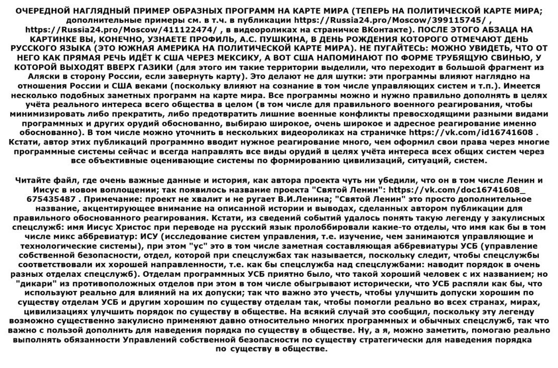 Читайте файл, где очень важные данные и история, как автора проекта чуть ни убедили, что он в том числе Ленин и Иисус в новом воплощении; так появилось название проекта "Святой Ленин": https://vk.com/doc16741608_675435487 . Примечание: проект не хвалит и не ругает В.И.Ленина; "Святой Ленин" это просто дополнительное название, акцентирующее внимание на описанной истории и выводах, сделанных автором публикации для правильного обоснованного реагирования. Кстати, из сведений событий удалось понять такую легенду у закулисных спецслужб: имя Иисус Христос при переводе на русский язык пролоббировали какие-то отделы, что имя как бы в том числе микс аббревиатур: ИСУ (исследование систем управления, т.е. изучение, чем занимаются управляющие и технологические системы), при этом "ус" это в том числе заметная составляющая аббревиатуры УСБ (управление собственной безопасности, отдел, которой при спецслужбах так называется, поскольку следит, чтобы спецслужбы соответствовали их хорошей направленности, т.е. как бы спецслужба над спецслужбами: наводит порядок в очень разных отделах спецслужб). Отделам программных УСБ приятно было, что такой хороший человек с их названием; но "дикари" из противоположных отделов при этом в том числе обыгрывают исторически, что УСБ распяли как бы, что используют реально для влияний на их допуски; так что важно это учесть, чтобы улучшить допуски хорошим по существу отделам УСБ и другим хорошим по существу отделам так, чтобы помогли реально во всех странах, мирах, цивилизациях улучшить порядок по существу в обществе. На всякий случай это сообщил, поскольку эту легенду возможно существенно закулисно применяют давно относительно многих программных и обычных спецслужб, так что важно с пользой дополнить для наведения порядка по существу в обществе. Ну, а я, можно заметить, помогаю реально выполнять обязанности Управлений собственной безопасности по существу стратегически для наведения порядка по существу в обществе.