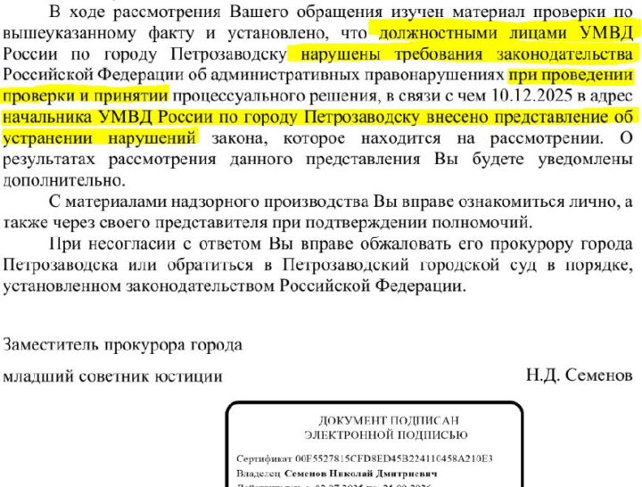 Позже Елене пришел ответ от прокуратуры. В ведомстве провели проверку и выяснили, что в работе полиции действительно были нарушения. 10 декабря начальнику УМВД по Петрозаводску вынесено представление об устранении этих нарушений. Сейчас оно на рассмотрении. О результатах матери обещают сообщить дополнительно.