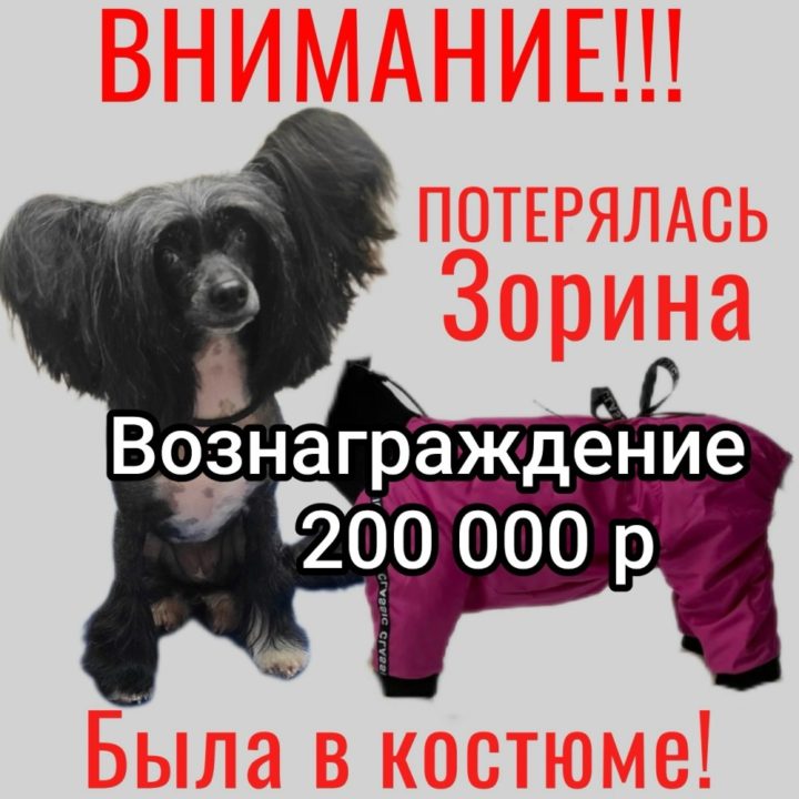 Зорина пропала 20 декабря прошлого года с переулка Медвежий, 14А: собака испугалась взрыва петард и убежала в лес. В тот день ее искали до 22:00, но безрезультатно. Спустя месяц Зорину продолжают искать хозяева и волонтеры. Восьмилетней собаке породы Китайская хохлатая требуется медподдержка и спецпитание. У Зорины черный окрас, небольшие белые пряди и большие уши. В день пропажи она была в сиреневом комбинезоне.
