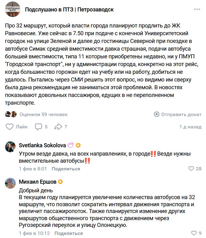— В текущем году планируется увеличение количества автобусов на 32 маршруте, что позволит сократить интервал движения транспорта и увеличит пассажиропоток. Также планируется изменение других маршрутов общественного транспорта с движением через Ругозерский переулок и улицу Олонецкую, — написал Михаил Ершов.