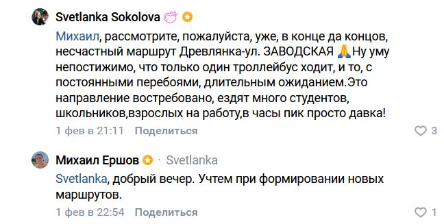 В комментариях также пожаловались, что с Древлянки трудно добраться на улицу Заводскую. По этому маршруту ездят много студентов, школьников и взрослых, но ходит только один троллейбус. Михаил Ершов пообещал учесть эту жалобу при формировании новых маршрутов.