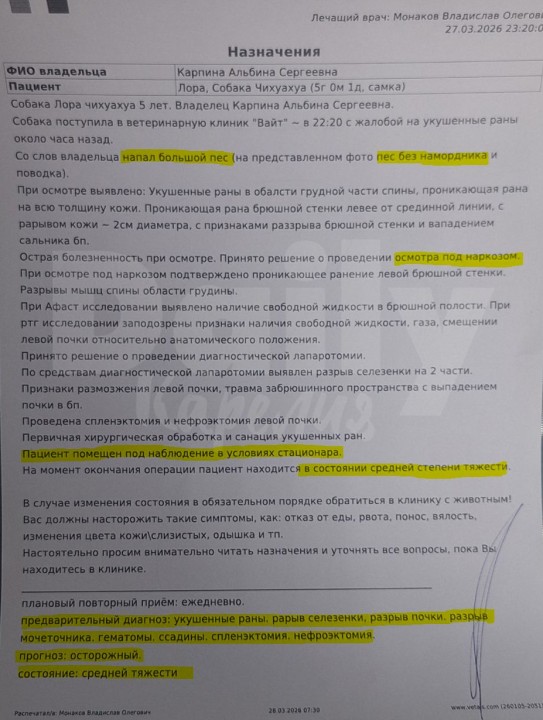 Раненую Лору повезли в круглосуточную ветеринарную клинику. Бедняжка серьезно пострадала: ей диагностировали укушенные раны, разрыв селезенки, почки и мочеточника, а также гематомы, ссадины. Собаке проверили спленэктомию (полное или частичное удаление селезенки) и нефрэктомию (удаление почки). Ветеринары оценивают ее состояние как средней тяжести.