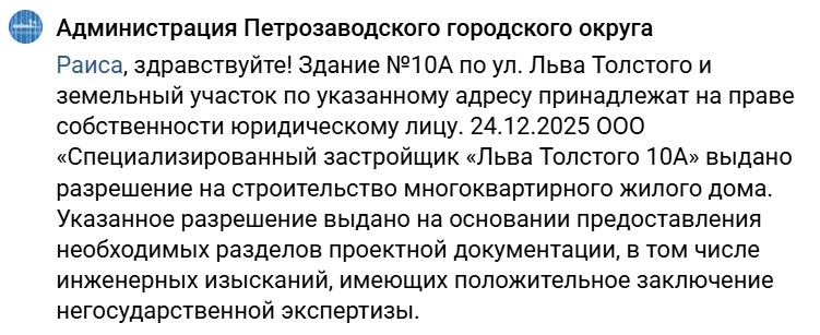 В мэрии города жильцам заявили, что разрешение на строительство многоквартирного жилого дома выдано ООО «Специализированный застройщик «Льва Толстого 10А». Согласно открытым данным, компанией руководит Александр Анатольевич Шмаеник, бывший владелец и основатель строительной империи «САНА» в Петрозаводске, с именем которой был связан скандал с дольщиками в Петрозаводске.