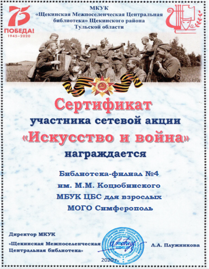 Библиотека-филиал №4 им. М.М. Коцюбинского МБУК ЦБС для взрослых МОГО Симферополь стала дипломантом сетевой акции «Искусство и война», организатором которой выступило Муниципальное казенное учреждение культуры «Щекинская Межпоселенческая Центральная библиотека» г. Щекино Тульской области.