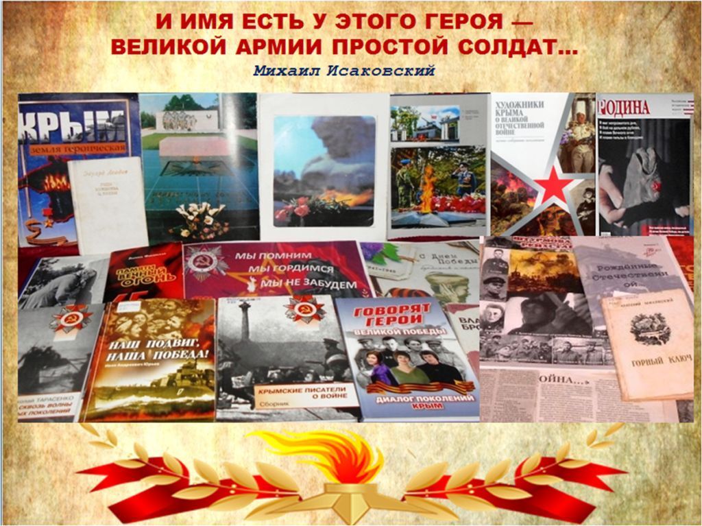 Вниманию читателей и удаленных пользователей представили книги, статьи из периодических изданий из фонда библиотеки, посвященные солдатам Великой Отечественной войны, многие из которых навечно остались лежать в братских могилах, до сих пор оставаясь безымянными. В числе предложенных к прочтению краеведческих изданий – сборники «Говорят герои Великой Победы. Диалог поколений», «Крымские писатели о войне», альбомы «Художники Крыма о Великой Отечественной войне», «Симферополь», военно-патриотические краеведческие издания, а также авторские издания крымских поэтов и писателей, в числе которых Борис Серман, Илья Сельвинский, Александр Рудь, Лариса Фисейская, Анатолий Милявский и др., посвященные «великим тем годам», мужеству и героизму советского народа, с честью победившего в самой страшной войне 20 века.
