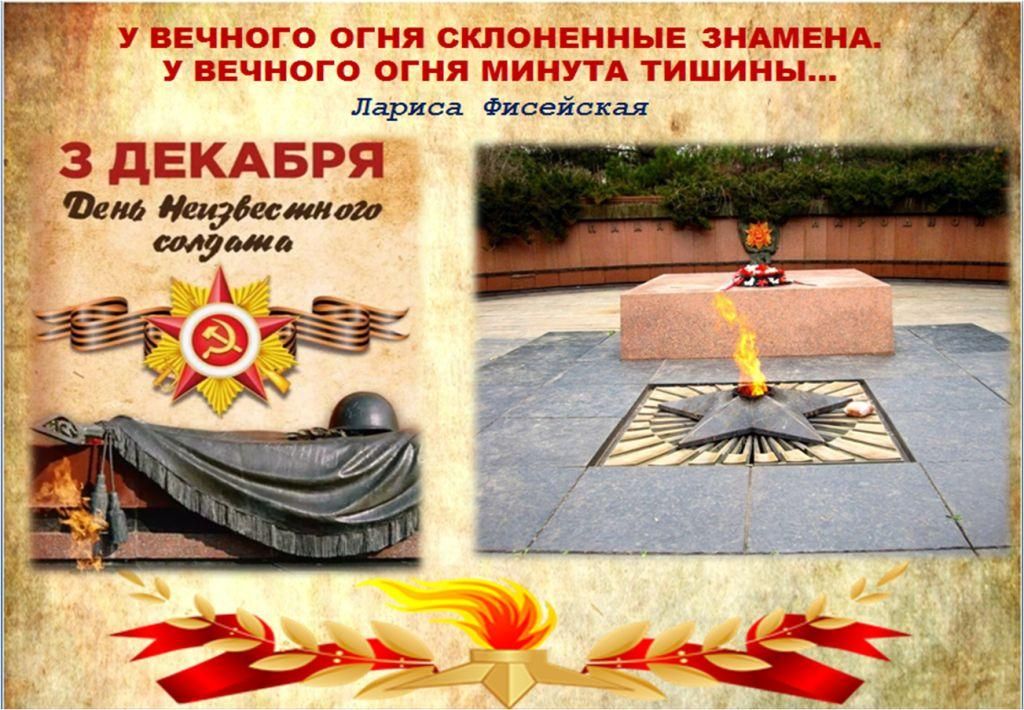 Эти скорбные и гордые строки известного поэта Михаила Исаковского стали лейтмотивом библио-реквиема «Пламя ваших сердец – это вечный огонь», организованного сотрудниками симферопольской библиотеки-филиала №4 им. М.М. Коцюбинского в рамках программы историко-патриотического проекта «Мы – наследники Победы! Нам мира завещано беречь», в преддверии Дня Неизвестного солдата – памятной даты в истории России, отмечаемой ежегодно 3 декабря.