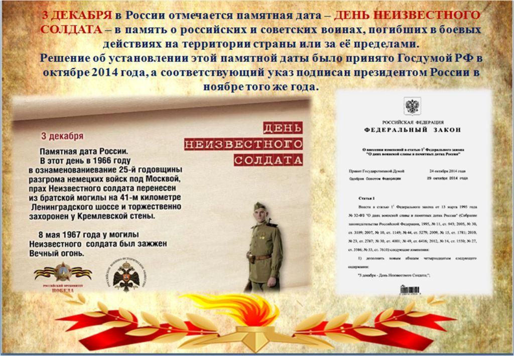 Дата была выбрана не случайно. Именно в этот день в декабре 1966 года, в ознаменование 25-й годовщины разгрома немецко-фашистских войск под Москвой, прах неизвестного солдата из братской могилы советских воинов на 41-м километре Ленинградского шоссе был перенесен и торжественно захоронен у стены Московского Кремля.
