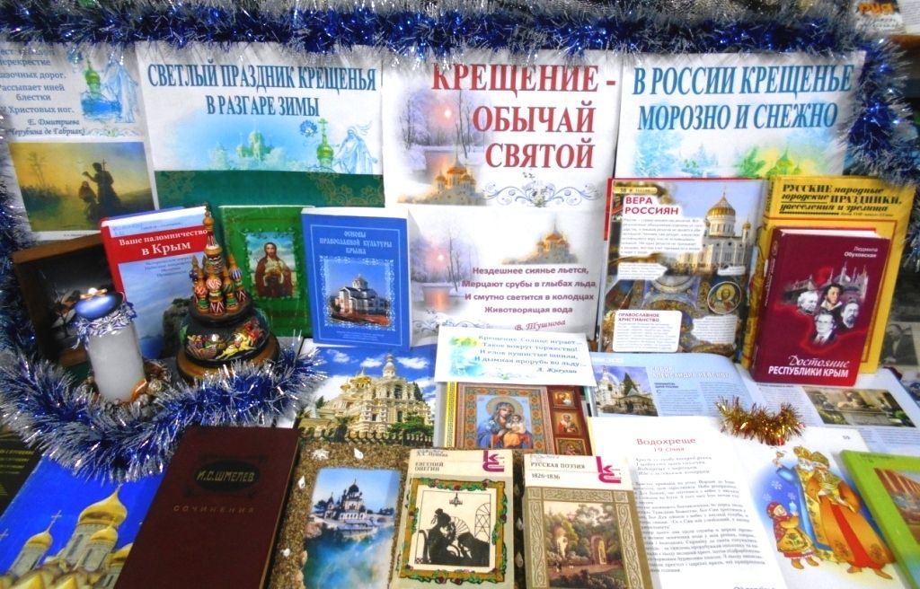Информационным сопровождением посиделок стала книжная выставка-инсталляция, центральное место на которой заняли «Основы православной культуры Крыма», «Ваше паломничество в Крым», «Азы православия», «Русский народ, его обычаи, обряды, предания, суеверия и поэзия», «Православный календарь», издания с репродукциями картин «Крещение» И. Айвазовского, «Крещенское водосвятие» Б. Кустодиева, «Явление Христа народу» А. Иванова и др.
