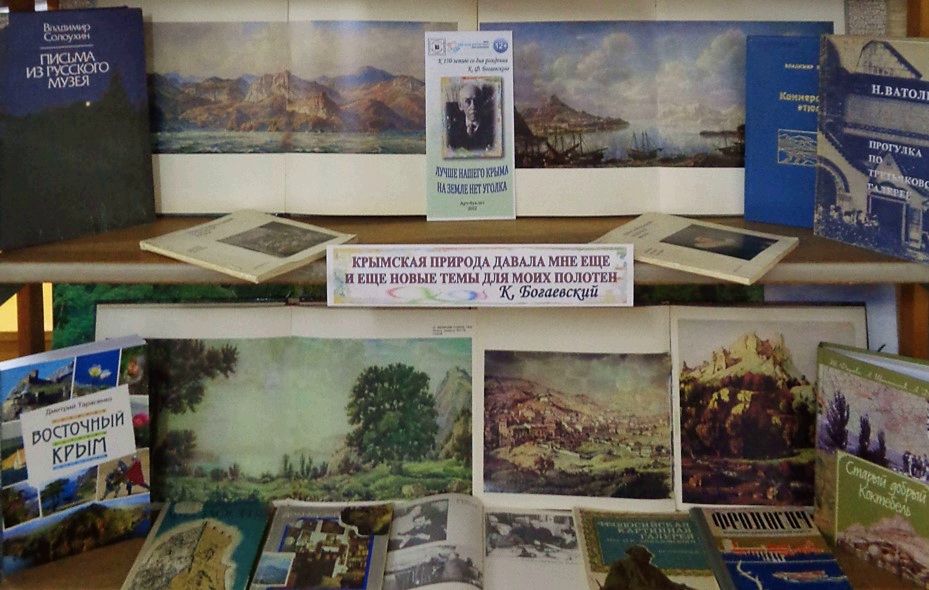 Разделы выставки «Воссоздатель» исторического пейзажа» (М.Волошин) и «Крымская природа давала мне еще и еще новые темы для моих полотен» (К. Богаевский) познакомят читателей с репродукциями лучших работ художника, многие из которых занимают достойное место в экспозициях Третьяковкой галереи в Москве, Русском музее Санкт-Петербурга, Феодосийской картинной галерее, художественных музеях Севастополя и Симферополя. Информационным дополнением к выставке стал арт-буклет «Лучше нашего Крыма на земле нет уголка», подготовленный сотрудниками библиотеки.