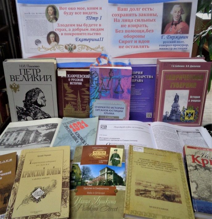 Книжная выставка «Служение Отечеству и Закону», центральное место на которой заняли краеведческие издания из фонда библиотеки, стала информационным сопровождением мероприятия. Представленные на ней материалы познакомили читателей с малоизвестными страницами истории прокуратуры Крыма: хроникой становления судебной системы полуострова в ХIХ веке («Таврическая губерния. История в очерках» Геннадия Бабенко и Валерия Дюличева), деятельностью губернского прокурора в годы Крымской войны, сохранением и эвакуацией архива судебных дел («Таврическая губерния во время Крымской войны» Арсения Маркевича), прокурорском надзоре за органами полиции и карантинными учреждениями («Действовать энергично и по закону. История политической полиции Крыма» Виктора Королёва, «Правовые основы создания и деятельности карантинных учреждений в Российской империи в конце XVIII - начале XX веков» Бориса Змерзлого).