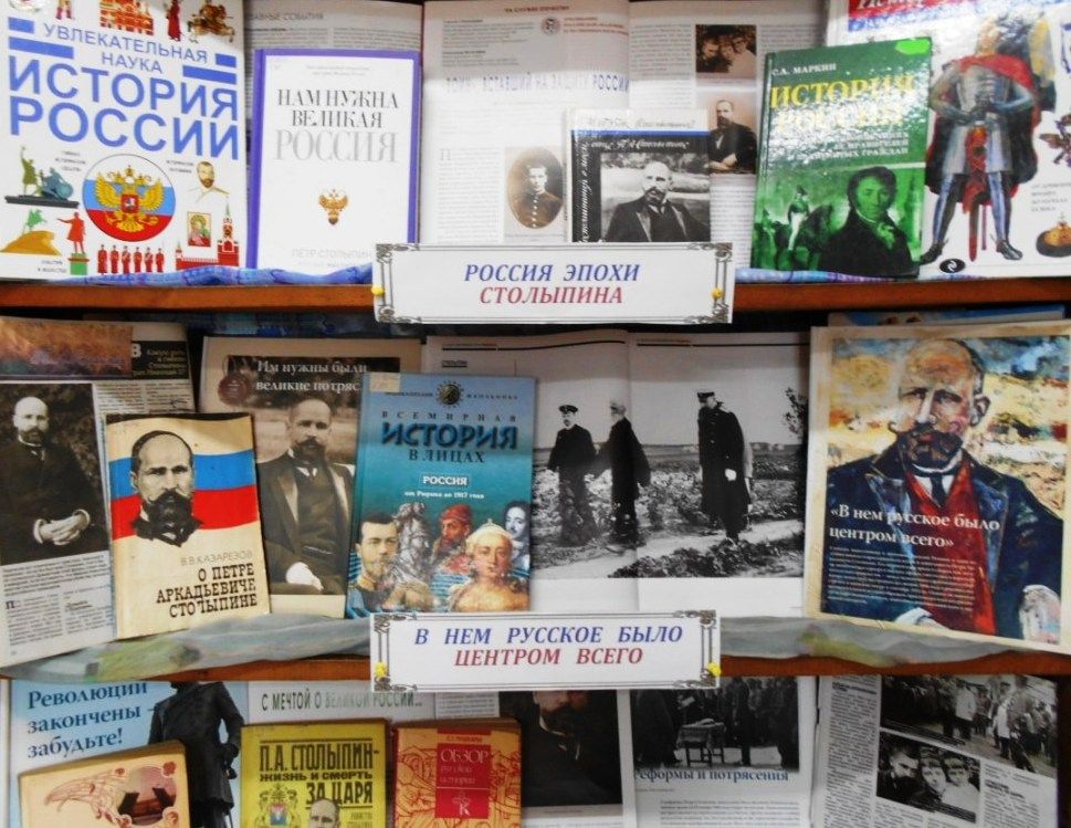 Выставка включает в себя три раздела – «Россия эпохи Столыпина», «В нем русское было центром всего» и «Он верил в Россию». Центральное место на ней заняло издание трудов блестящего политика, премьер-министра Российской империи, гражданина Петра Аркадьевича Столыпина «Нам нужна Великая Россия» и книги из фонда библиотеки: «Всемирная история в лицах: История России от Рюрика до 1917 года» В.П. Бутромеева, «О Петре Аркадьевиче Столыпине» В.В. Казарезова, «Столыпин без легенд» П.Н. Зырянова, «Обзор русской истории» С.Г. Пушкарева, сборники «Россия на рубеже веков: исторические портреты», «П.А. Столыпин – жизнь и смерть за царя», др.