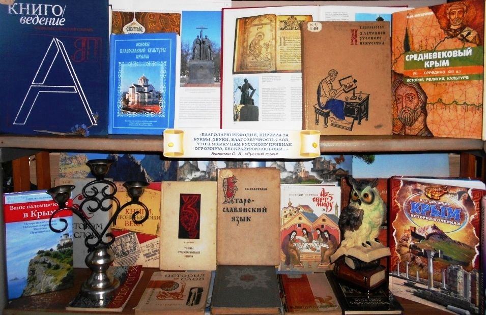 «Слава вам, братья, славян просветители, церкви славянской святые отцы,…слава вам, грамоты нашей творцы!», – эти строки стихотворения «Хвалебная песнь Святым Мефодию и Кириллу» Михаила Розенгейма стали цитатой–лейтмотивом выставки-летописи «И будет славить Русь родная святых апостолов славян», приуроченной библиотекой-филиалом №4 им. М.М. Коцюбинского ЦБС для взрослых Симферополя ко Дню славянской письменности и культуры и к 1195-летию со дня рождения Святого равноапостольного Кирилла.