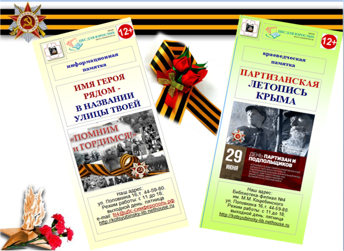 В преддверии этой исторической даты сотрудники симферопольской библиотеки-филиала №4 им. М.М. Коцюбинского провели в городском парке Шевченко краеведческую акцию «Не дать забыть Великий Подвиг». В ходе акции состоялся опрос жителей и гостей крымской столицы «Помнит Симферополь, не забудет никогда», показавший, что в большинстве своем симферопольцы знакомы с историей поименования улиц  именами  Героев-освободителей. Примечательно, что улица Крымских партизан находится в микрорайоне обслуживания библиотеки.
