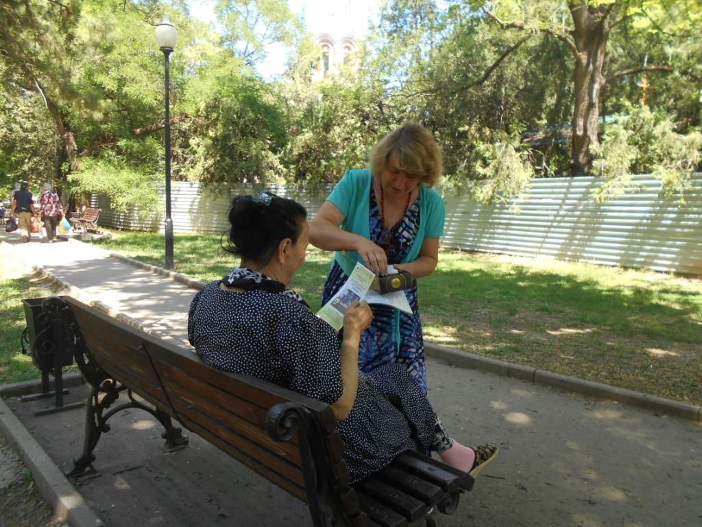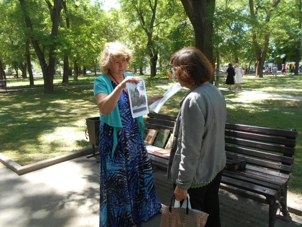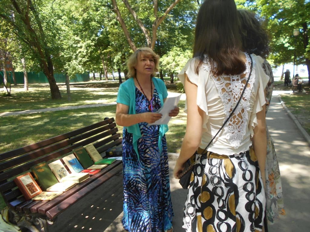 Привлекли внимание отдыхающих в парке горожан книги военной тематики, представленные в зоне мини-буккросинга «Живая память о войне. Читаем, чтобы помнить», который сопровождался раздачей краеведческих памяток «Имя Героя рядом – в названии улицы твоей» и «Партизанская летопись Крыма», подготовленных сотрудниками библиотеки и приглашающих к чтению историко-краеведческой литературы из фонда библиотеки.