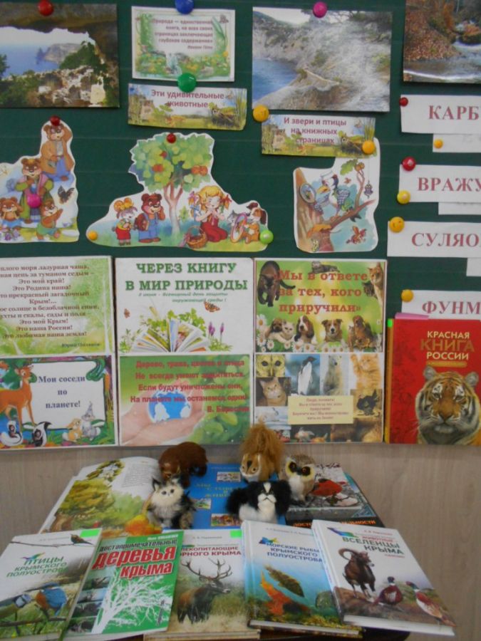 Информационным сопровождением мероприятия стала книжная выставка «Через книгу в мир природы», познакомившая ребят с красочными изданиями: «Красная книга России. Животные» А.В. Тихонова, иллюстрированный путеводитель «Природа России» Р.Ю. Шевцова, энциклопедии «Животный мир России» и «Достопримечательности России» из серии «В мире знаний» и др. Особое внимание юных природоведов привлекли сборник произведений крымских авторов Владимира Орлова, Юрия Полякова и Лидии Огурцовой «Наш дом под крышей голубой», «Птицы крымского полуострова» М.М. Бескаравайного, «Цветной атлас растений Крыма» Л.П. Вахрушевой и Н.В. Воробьевой, «Энциклопедия лесника. Млекопитающие Горного Крыма» и «Энциклопедия лесника. Животные – вселенцы Крыма» А.В. Паршинцева, «Достопримечательные деревья Крыма» И.М. Коваленко, «Морские рыбы Крымского полуострова» А.Р. Болтачева и Е.П. Карпова и другие краеведческие книги.