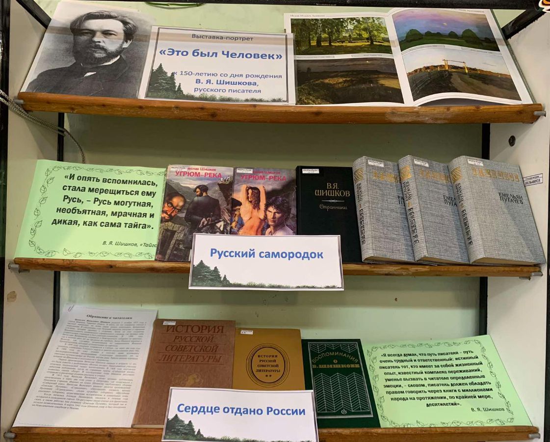 К 150-летию со дня рождения Вячеслава Яковлевича Шишкова, в библиотеке-филиале № 7 им. Т. Г. Шевченко г. Симферополя открылась выставка-портрет «Это был Человек». Раздел «Сердце отдано России» предлагает познакомиться с биографией писателя и его плодотворной творческой дорогой. Второй раздел «Русский самородок» рекомендует читателям знаменитые романы писателя «Угрюм-Река», неоконченный исторический роман «Емельян Пугачев», «Странники» и др. После войны в населенных пунктах появились скульптуры и бюсты писателя, в честь него учредили стипендию для студентов, проявивших литературный талант. В любимом Шишковым Зауралье, создали географические объекты, одним из них стала трасса, переходящая в Чуйский тракт.