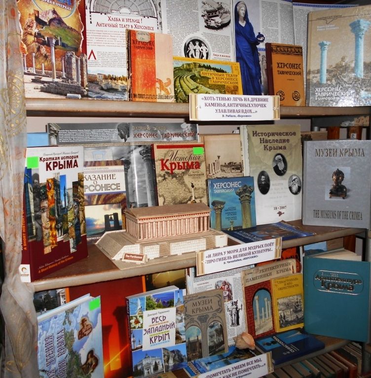 Уникальное издание «Херсонес Таврический: путеводитель по музею и раскопкам», вышедшее в «Крымиздате» в 1962 году, «Херсонес Таврический в мировой истории» В. Хапаева и М. Золотарева, «История театра в Крыму (1820-1920)» С.П. Шендриковой, «Весь Западный Крым» Д. Тарасенко, «Музеи Крыма», статьи «Полуострова сокровищ», «Крымских известий», «Московского комсомольца в Крыму», другие краеведческие издания, представленные на выставке, знакомят читателей с историей обнаружения «патриархом крымской археологии» О.И. Домбровским античного театра в Херсонесе Таврическом, возведенного во второй половине IV – начале III века до н.э.