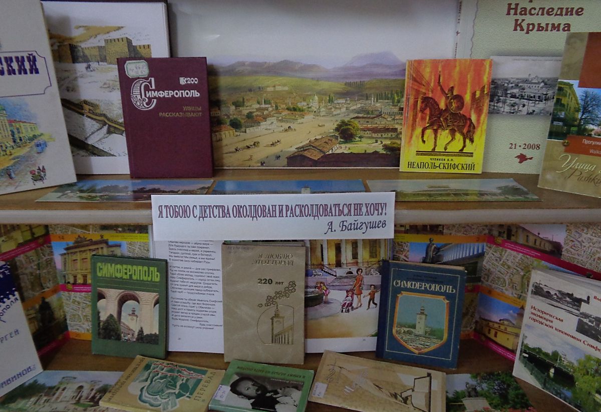 Издания, представленные в разделах «Мой город-собиратель, сердце Крыма!» (О. Голубева), «Наша южная столица над тобой века не властны!» (Л. Фисейская), «Я тобою с детства околдован и расколдоваться не хочу» (А. Байгушев) знакомят читателей с прошлым и настоящим крымской столицы. «Симферополь – город пользы» Геннадия Бабенко и Валерия Дюличева, «Неаполь Скифский» Бориса Чупикова, «Симферополь особенный, неповторимый: 225 лет фактов» Виктора Королева, «Симферополь: улицы рассказывают» Владимира и Олега Широковых, «День в Симферополе» Игоря Гасско рассказывают о достопримечательностях города. На территории современного Симферополя соседствуют следы человеческой жизни разных эпох – от палеолита до средневековья: стоянка первобытного человеа в Чокурче (восточной окраине города), столица позднескифского государства – Неаполь Скифский, поселение Ак-Мечеть – резиденция калги-султана (второго по значимости лица после хана в Крымском ханстве). История Симферополя – столичного города, вновь образованной Таврической области, начинается летом 1784 года, когда по соседству с Ак-Мечетью появляются первые постройки нового областного центра. Имя Симферополь будущему городу предложил ученый-богослов Евгений Булгарис: «Сие наименование означает город пользы, а потому герб – улей с пчёлами, имеющий вверху надпись: Полезное».