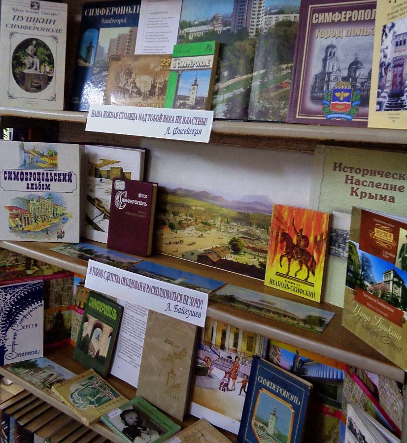 Особый интерес любителей краеведения вызвали представленные на выставке «Историческая эволюция городской топонимии Симферополя» Владимира Полякова, «Прогулки по Симферополю. Улица Пушкина» Людмилы Вьюницкой и Александра Эйлера, а также «Симферопольский альбом» (редактор-составитель А. Тархов), включающий почти 400 ретро-фотографий Симферополя.