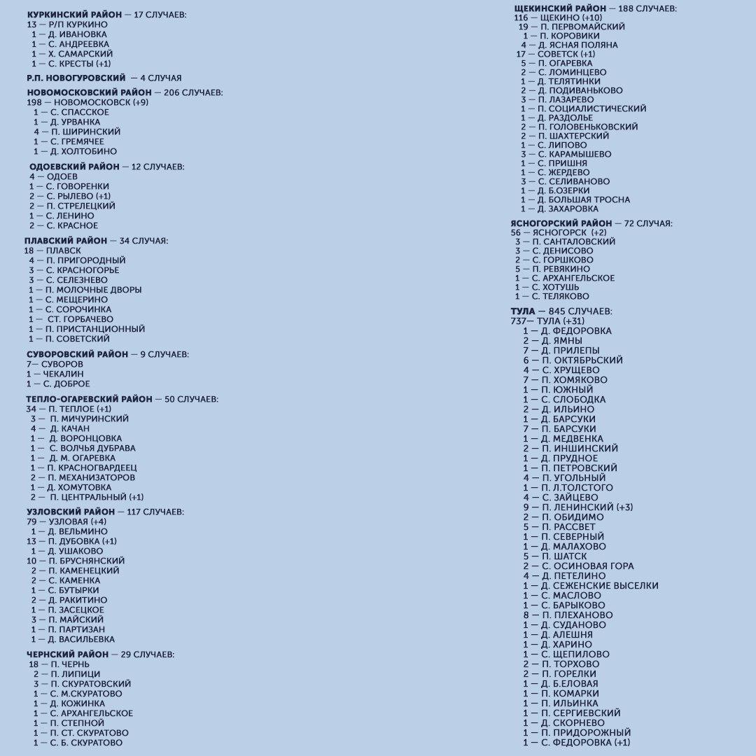 Добавим также, что Тульская область сегодня занимает девятое место по числу заболевших в России, после Москвы и Московской области, а также Санкт-Петербурга, Нижегородской, Мурманской, Свердловской области, а также Краснодарского края и Дагестана.