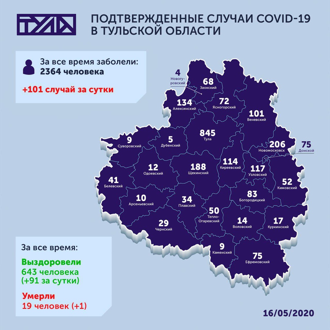 Всего за минувшие сутки, 15 мая, на территории области был зарегистрирован 101 новый случай заражения опасной инфекцией. Она подтверждена у жителей Тулы, Донского, Алексинского, Арсеньевского, Белевского, Богородицкого, Веневского, Дубенского, Ефремовского, Кимовского, Киреевского, Куркинского, Новомосковского, Одоевского, Тепло-Огаревского, Узловского, Щекинского и Ясногорского районов. О путях распространения инфекции сообщается, что 8 человек работают в Москве, остальные заразились от заболевших ранее.