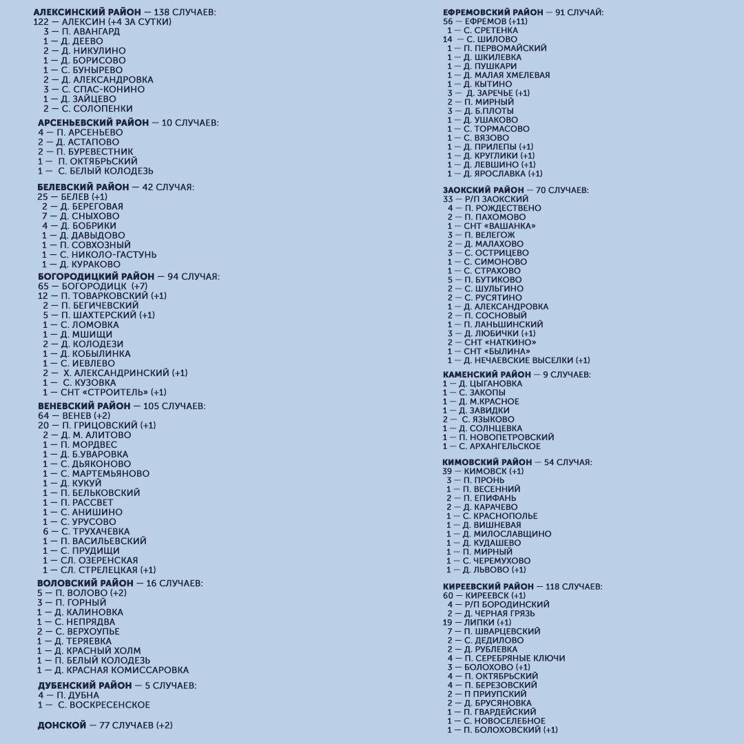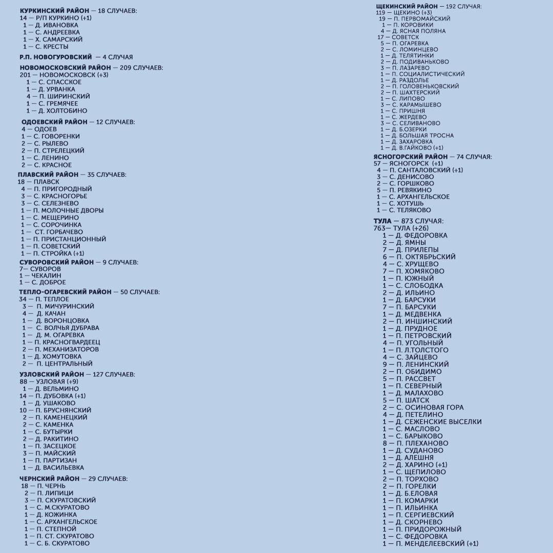 Добавим также, что Тульская область в настоящий момент занимает девятое место по числу заболевших в России, после столичного региона, Санкт-Петербурга, Нижегородской, Мурманской, Свердловской области, а также Краснодарского края и Дагестана.