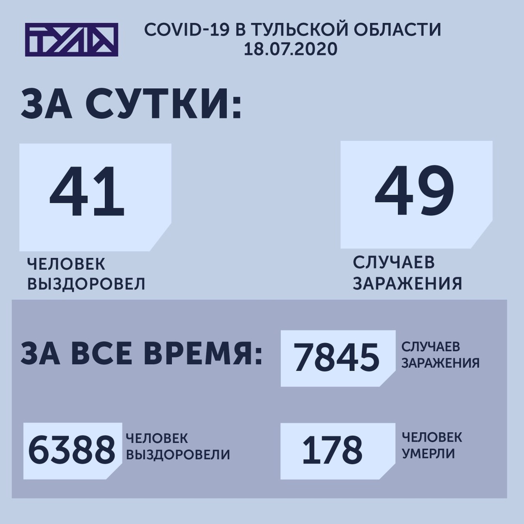Сегодня, 18 июля, в Тульской области коронавирусом заболели еще 49 человек. Инфекцию подтвердили у жителей 12 городов и МО региона. Всего же количество заразившихся COVID-19 за все время пандемии к настоящему моменту уже приближается к 8 000 человек (7845 по состоянию на 18 июля). Из них 6388 - победили заболевание, а 178 скончались.