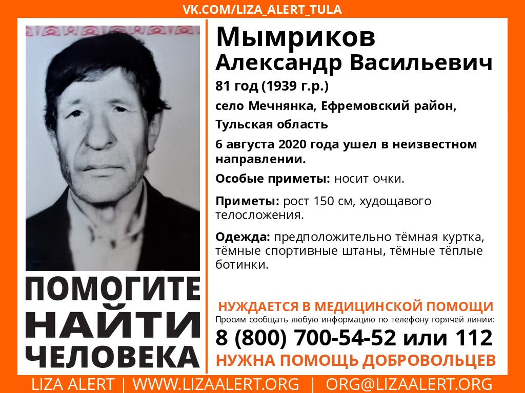 В Тульской области пропал пенсионер. 81-летний Мымриков Александр Васильевич, ушел из дома в селе Мечнянка Ефремовского района 6 августа. С тех пор его местонахождение неизвестно.