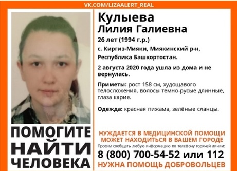 26-летняя Кулыева Лилия Галыевна ушла из дома в селе Киргиз-Мияки (республика Башкортостан) 2 августа. С тех пор о ней ничего не известно.