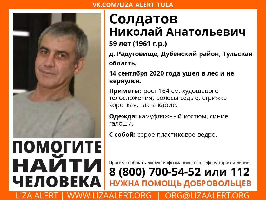 В Тульской области пропал 59-летний мужчина. Солдатов Николай Анатольевич сегодня, 14 сентября 2020 года, ушел в лес рядом с деревней Радуговище Дубенского района и не вернулся.