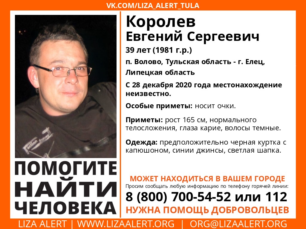 В поселке Волово Тульской области пропал 39-летний Евгений Сергеевич Королев. О его местонахождении ничего не известно с 28 декабря 2020 года.