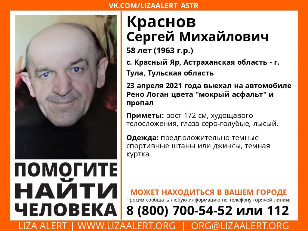 Краснов Сергей Михайлович из села Красный Яр, Астраханской области пропал без вести 23 апреля 2021 года. Из дома он выехал на автомобиле Рено Логан цвета "мокрый асфальт".
