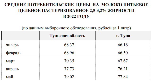 В январе 2022 года цена на литр молока составляла: в области – 68,37 рублей, в Туле – 66,16 рублей.